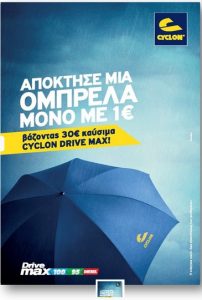 Συγκεκριμένα, όσοι πελάτες επιλέξουν να ανεφοδιαστούν με καύσιμα CYCLON DRIVE MAX αξίας 30€ και άνω, θα μπορούν να αποκτήσουν μία εύχρηστη σπαστή ομπρέλα με επιπλέον χρέωση μόλις 1€.
