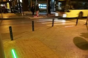 Η ενδοδαπέδια ράβδος LED που τοποθετήθηκε ανάμεσα στα πλακίδια της διάβασης συνδέεται με το σύστημα της σηματοδότησης και εκπέμπει κόκκινο ή πράσινο φως, σε αντιστοιχία με τους φωτεινούς σηματοδότες για την κίνηση των πεζών.