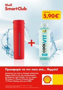Από σήμερα, κάθε καταναλωτής που επιλέγει τα πρατήρια καυσίμων Shell για τον ανεφοδιασμό του οχήματός του, έχει τη δυνατότητα να αποκτήσει συλλεκτικά θερμός Shell και το νέο, εμπλουτισμένο με βιταμίνες νερό CoolVit, συμβάλλοντας παράλληλα στην προστασία του περιβάλλοντος, καθώς με την αγορά κάθε θερμός η Shell συμβάλλει στην αφαίρεση δύο κιλών πλαστικού από τη θάλασσα!