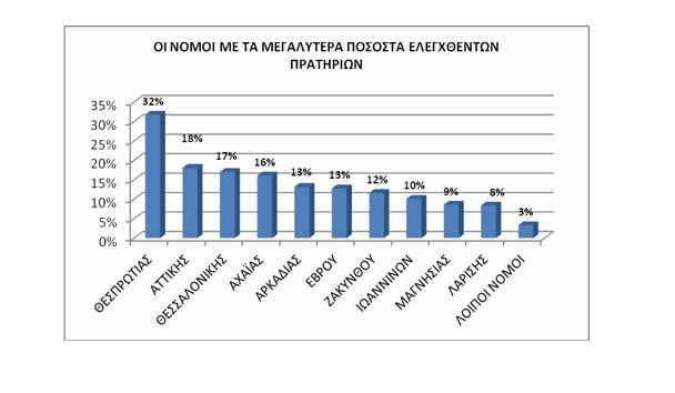 Στο διάγραμμα που ακολουθεί, απεικονίζονται οι νομοί, όπου καταγράφηκαν τα δέκα (10) μεγαλύτερα ποσοστά ελέγχων: