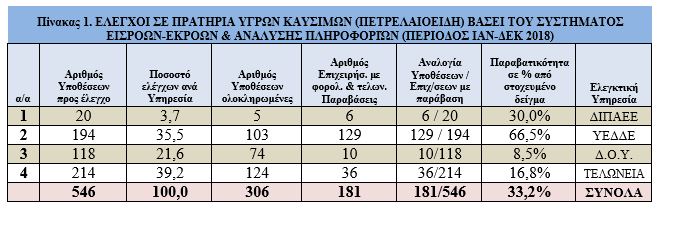 Ο αριθμός πρατηρίων καυσίμων, που ελέγχθηκαν πανελλαδικά, με βάση το σύστημα εισροών-εκροών και την αξιοποίηση πρόσθετων πληροφοριών, ανέρχεται σε 546. Από τις ολοκληρωμένες υποθέσεις την 31-12-2018 έχουν βρεθεί παραβάσεις σε 181 οντότητες (ποσοστό παραβατικότητας 33,2% επί του συνόλου των ελέγχων).