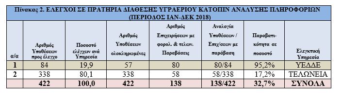 Σημ: Το ποσοστό αυτό δεν αποτυπώνει το εν γένει ποσοστό φοροδιαφυγής ή λαθρεμπορίου στον κλάδο αυτό, δεδομένου ότι οι σχετικοί έλεγχοι διενεργήθηκαν στα πρατήρια που είχαν επιλεγεί για έλεγχο με βάση ειδικά κριτήρια επικινδυνότητας.