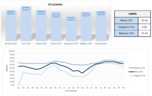 Πιο αναλυτικά, η μέση ΟΤΣ στο χρονικό διάστημα μεταξύ 18 Μαρτίου και 24 Μαρτίου ανήλθε στα €55,86/MWh, δηλαδή μειωμένη σε ποσοστιαία βάση κατά 5,00% από τη μέση ΟΤΣ της αμέσως προηγούμενης εβδομάδας, με τη μέγιστη και την ελάχιστη ΟΤΣ να διαμορφώνονται στα €73,45/MWh και στα €0,00/MWh αντιστοίχως. Αξίζει να αναφερθεί ότι η υψηλότερη μέση ΟΤΣ, ανά ημέρα, που καταγράφηκε το προηγούμενο επταήμερο, επετεύχθη την Τρίτη, 19 Μαρτίου, φτάνοντας τα €64,98/MWh.