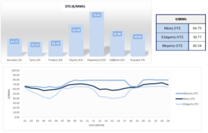 Πιο αναλυτικά, η μέση ΟΤΣ στο χρονικό διάστημα μεταξύ 1 Απριλίου και 7 Απριλίου ανήλθε στα €64,75/MWh, δηλαδή αυξημένη σε ποσοστιαία βάση κατά 5,23% από τη μέση ΟΤΣ της αμέσως προηγούμενης εβδομάδας, με τη μέγιστη και την ελάχιστη ΟΤΣ να διαμορφώνονται στα €80,54/MWh και στα €39,77/MWh αντιστοίχως. Αξίζει να αναφερθεί ότι η υψηλότερη μέση ΟΤΣ, ανά ημέρα, που καταγράφηκε το προηγούμενο επταήμερο, επετεύχθη την Παρασκευή, 5 Απριλίου, φτάνοντας τα €71,62/MWh.