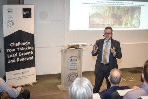 Ανοίγοντας την εκδήλωση, ο πρύτανης του Alba Δρ. Κώστας Αξαρλόγλου, είπε χαρακτηριστικά: «Η σειρά The Alba Leading Scholars Series είναι μία σειρά διαλέξεων στην οποία έχουμε την τιμή να φιλοξενούμε κάθε φορά έναν ηγέτη της σκέψης που διακρίνεται για την ακαδημαϊκή του έρευνα και την επίδραση αυτής στο management thinking. Σε αυτή τη σειρά καλούμε ηγέτες που εξισορροπούν την ακαδημαϊκή έρευνα με την εφαρμογή στην πραγματικότητα του επιχειρείν και κάνουμε αυτήν τη γνώση σχετική με την επιχειρηματική κοινότητα. Και αυτός είναι ο ρόλος ενός Business School. Σήμερα έχουμε την τιμή να φιλοξενούμε τον καθηγητή Μιχάλη Ιακωβίδη, ο oποίος θα μοιραστεί μαζί μας τα insights του για τη σύγχρονη οικονομία, την ψηφιακή οικονομία».