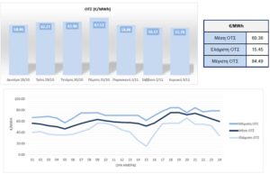 Πιο αναλυτικά, η μέση ΟΤΣ στο χρονικό διάστημα μεταξύ 28 Οκτωβρίου και 3 Νοεμβρίου ανήλθε στα €60,36/MWh δηλαδή αυξημένη σε ποσοστιαία βάση κατά 6,49% από τη μέση ΟΤΣ της αμέσως προηγούμενης εβδομάδας, με τη μέγιστη και την ελάχιστη ΟΤΣ να διαμορφώνονται στα €84,49/MWh και στα €15,45/MWh αντιστοίχως. Αξίζει να αναφερθεί ότι η υψηλότερη μέση ΟΤΣ, ανά ημέρα, που καταγράφηκε την προηγούμενη εβδομάδα, επετεύχθη την Πέμπτη, 31 Οκτωβρίου, φτάνοντας τα €67,53/MWh.