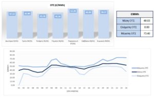 Πιο αναλυτικά, η μέση ΟΤΣ στο χρονικό διάστημα μεταξύ 3 Φεβρουαρίου και 9 Φεβρουαρίου ανήλθε στα €48,03/MWh, δηλαδή μειωμένη σε ποσοστιαία βάση κατά 13,52% από τη μέση ΟΤΣ της αμέσως προηγούμενης εβδομάδας, με τη μέγιστη και την ελάχιστη ΟΤΣ να διαμορφώνονται στα €73,40/MWh και στα €0,00/MWh αντιστοίχως. Αξίζει να αναφερθεί ότι η υψηλότερη μέση ΟΤΣ, ανά ημέρα, που καταγράφηκε την προηγούμενη εβδομάδα, επετεύχθη την Παρασκευή, 7 Φεβρουαρίου, φτάνοντας τα €52,29/MWh.