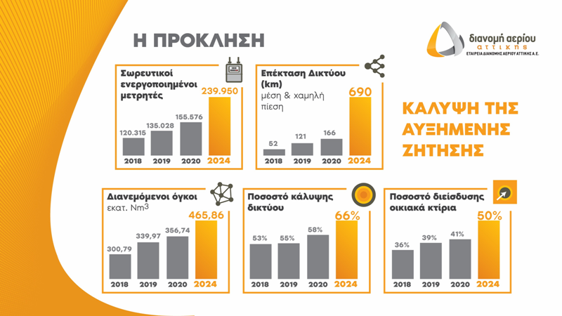 Το νέο φιλόδοξο Πρόγραμμα Ανάπτυξης της Εταιρείας Διανομής Αερίου Αττικής για την περίοδο 2020-2024, σχεδιάστηκε με αυστηρά οικονομοτεχνικά κριτήρια και περιλαμβάνει την εντυπωσιακή επέκταση του δικτύου χαμηλής και μέσης πίεσης κατά 690 χιλιόμετρα την επόμενη πενταετία και τον διπλασιασμό σχεδόν των συνδέσεων, ήτοι 240 χιλιάδες ενεργοποιημένοι μετρητές το 2024, έναντι 135 χιλιάδες το 2019, με τους διανεμόμενους όγκους να αγγίζουν τα 466 εκατ. Nm3, από 340 εκατ. Nm3, στο τέλος του περασμένου έτους.