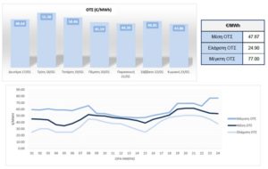 Πιο αναλυτικά, η μέση ΟΤΣ στο χρονικό διάστημα μεταξύ 17 Φεβρουαρίου και 23 Φεβρουαρίου ανήλθε στα €47,87/MWh, δηλαδή μειωμένη σε ποσοστιαία βάση κατά 10,27% από τη μέση ΟΤΣ της αμέσως προηγούμενης εβδομάδας, με τη μέγιστη και την ελάχιστη ΟΤΣ να διαμορφώνονται στα €77,00/MWh και στα €24,90/MWh αντιστοίχως. Αξίζει να αναφερθεί ότι η υψηλότερη μέση ΟΤΣ, ανά ημέρα, που καταγράφηκε την προηγούμενη εβδομάδα, επετεύχθη την Τρίτη, 18 Φεβρουαρίου, φτάνοντας τα €55,30/MWh.