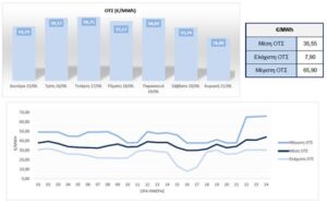 Πιο αναλυτικά, η μέση ΟΤΣ στο χρονικό διάστημα μεταξύ 15 Ιουνίου και 21 Ιουνίου ανήλθε στα €35,55/MWh, δηλαδή αυξημένη σε ποσοστιαία βάση κατά 3,43% από τη μέση ΟΤΣ της αμέσως προηγούμενης εβδομάδας, με τη μέγιστη και την ελάχιστη ΟΤΣ να διαμορφώνονται στα €65,90/MWh και στα €7,90/MWh αντιστοίχως. Αξίζει να αναφερθεί ότι η υψηλότερη μέση ΟΤΣ, ανά ημέρα, που καταγράφηκε την προηγούμενη εβδομάδα, επετεύχθη την Τετάρτη, 17 Ιουνίου, φτάνοντας τα €39,75/MWh.
