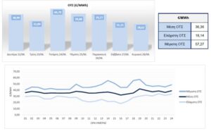 Αξίζει να αναφερθεί ότι η υψηλότερη μέση ΟΤΣ, ανά ημέρα, που καταγράφηκε την προηγούμενη εβδομάδα, επετεύχθη την Τετάρτη, 24 Ιουνίου, φτάνοντας τα €44,79/MWh.