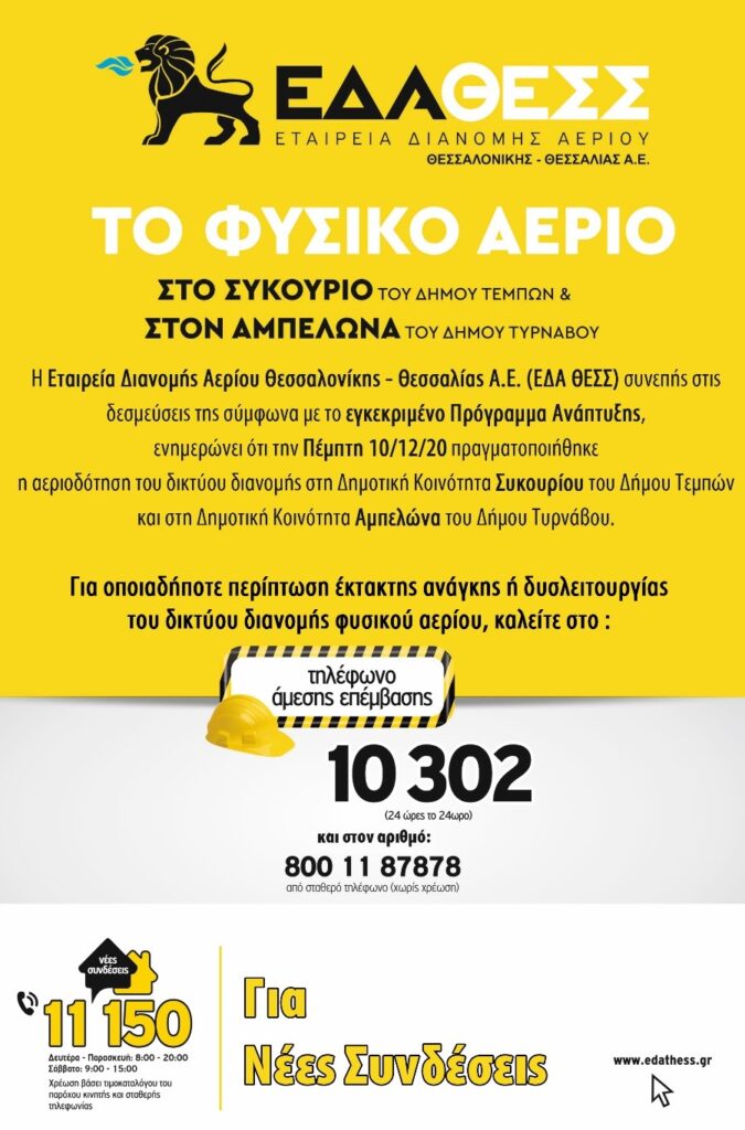 Η ΕΔΑ ΘΕΣΣ ενημερώνει ότι την Πέμπτη 10/12/2020, πραγματοποιήθηκε η αεριοδότηση του δικτύου διανομής στη Δημοτική Ενότητα Συκουρίου του Δήμου Τεμπών και στη Δημοτική Ενότητα Αμπελώνα του Δήμου Τυρνάβου.