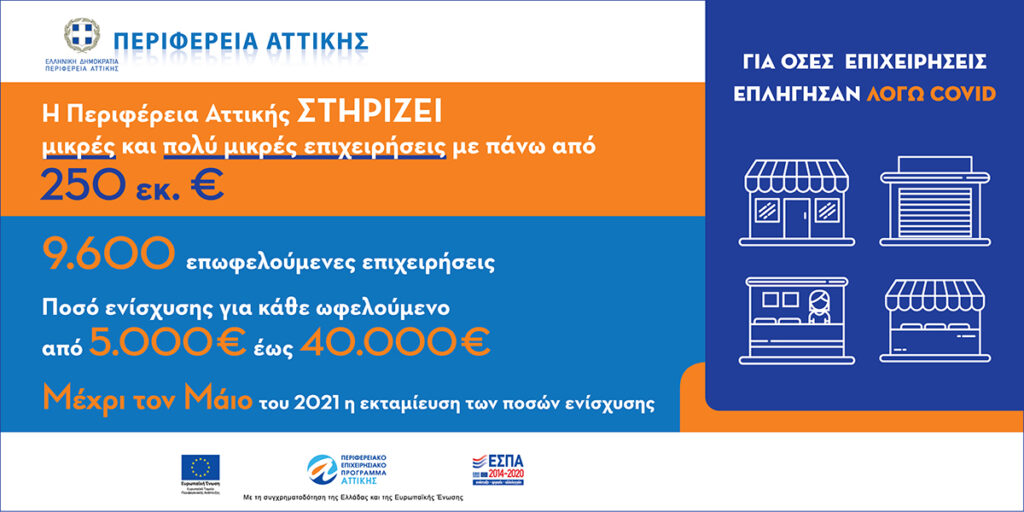 Η Περιφέρεια Αττικής στηρίζει περισσότερες από 9.600 μικρές και πολύ μικρές επιχειρήσεις που επλήγησαν από τον COVID-19, με πάνω από 250 εκ. € από το ΠΕΠ «Αττική 2014-2020».
