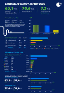 46,18% του φυσικού αερίου προήλθε από εισαγωγές φορτίων LNG, με 49 δεξαμενόπλοια να εκφορτώνουν συνολικά το 2020 στις δεξαμενές της Ρεβυθούσας (από 50 το 2019).