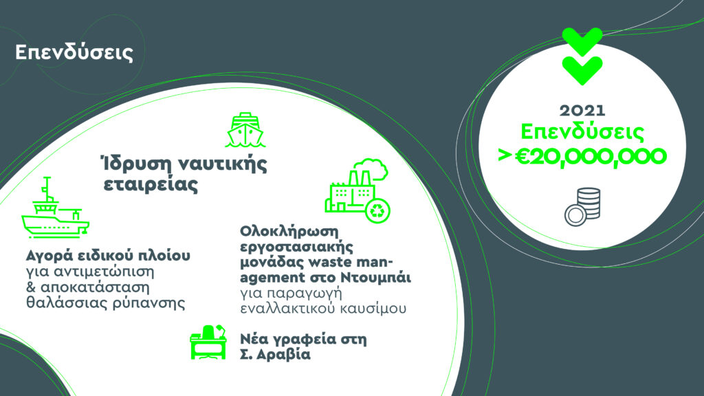Η σημασία που αποδίδει η εταιρία στη συγκεκριμένη αγορά υπογραμμίζεται και από το σχέδιο για ανάπτυξη μονάδας ενεργειακής αξιοποίησης αποβλήτων στα Ηνωμένα Αραβικά Εμιράτα, που θα χρηματοδοτηθεί από το επενδυτικό πλάνοτης εταιρίας που συνολικά ξεπερνά τα 20 εκατομμύρια ευρώ για το 2021. Ταυτόχρονα η εταιρία σχεδιάζει την είσοδό της στη ναυτιλία με αγορά ειδικού πλοίου που θα ενισχύσει ακόμα περισσότερο την επιχειρησιακή της ικανότητα για αντιμετώπιση περιστατικών θαλάσσιας ρύπανσης, ενώ επόμενος σταθμός της στο εξωτερικό θα είναι η Σαουδική Αραβία.