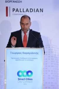 Ο Υφυπουργός Υποδομών και Μεταφορών, αρμόδιος για τις υποδομές, κ. Γεώργιος Καραγιάννης στον χαιρετισμό του, επισήμανε, μεταξύ άλλων, ότι το σύγχρονο πρόταγμα των βιώσιμων και «έξυπνων» πόλεων, των Smart Cities είναι το πολιτικό αφήγημα της νέας εποχής για τις πόλεις του δυτικού κόσμου. «Πρόκειται ουσιαστικά για τη συνάντηση δύο στρατηγικών στόχων. Για την αντιμετώπιση της κλιματικής κρίσης και του ψηφιακού μετασχηματισμού των λειτουργιών της πόλης», υπογράμμισε ο κ. Καραγιάννης. Και πρόσθεσε ότι «η σύγχρονη πρωτοποριακή πολιτική των πόλεων εκφράζεται σε ένα παγκοσμιοποιημένο επίπεδο μέσα από ένα τρίπτυχο πόλεις πράσινες-ανθεκτικές- και πάνω από όλα «έξυπνες». Όπως υπογράμμισε το Ταμείο Ανάκαμψης θα εξασφαλίσει την μετάβαση σε ένα πιο ψηφιακό, αλλά και πιο «πράσινο» μέλλον. Αναφέρθηκε στα έργα υποδομής του Υπουργείου ύψους 13 δις ευρώ, που καλύπτουν όλο το εύρος που πρέπει να παρέμβει η πολιτεία και θα αλλάξουν την εικόνα της χώρας τα επόμενα χρόνια. Και συμπλήρωσε ότι τη δεδομένη στιγμή υπάρχει στο Υπουργείο ένα πρόγραμμα 20 έργων ΣΔΙΤ που παρεμβαίνουν παντού, ύψους σχεδόν 4 δισ. ευρώ. Αυτά δημιουργούν το πλαίσιο, ώστε στον στόχο των «έξυπνων» πόλεων να δημιουργηθούν πρόσθετες υπεραξίες. Και ενδεικτικά ανέφερε το έργο που υλοποιείται στον ΟΣΕ που άπτεται του ψηφιακού μετασχηματισμού, με το ψηφιακό εισιτήριο, τις υπηρεσίες τηλεματικής, τις υπηρεσίες των «έξυπνων» σταθμών, ώστε ουσιαστικά να βελτιωθούν οι προσφερόμενες υπηρεσίες προς τον πολίτη. Επισήμανε ότι «μέσω του Ταμείου Ανάκαμψης υλοποιούμε μια πολύ μεγάλη προσπάθεια. Υλοποιούμε ουσιαστικά την αλλαγή της εικόνας των πόλεων» και ανέφερε την προμήθεια των «πράσινων» ηλεκτρικών λεωφορείων που θα αλλάξει την εικόνα των μετακινήσεων σε Αθήνα και Θεσσαλονίκη, τα ηλεκτρονικά διόδια, που αλλάζουν τις μετακινήσεις στους μεγάλους αυτοκινητοδρόμους, τις οπτικές ίνες που θα «περασθούν» σε όλους τους μεγάλους αυτοκινητοδρόμους και τον νέο προαστιακό σιδηρόδρομο της Δυτικής Αττικής και τις επεκτάσεις των σιδηροδρομικών έργων σε όλη την χώρα που θα διασυνδέσουν τα μεγάλα λιμάνια της χώρας. Και κλείνοντας, σημείωσε ότι οι Οργανισμοί Τοπικής Αυτοδιοίκησης έχουν μια ξεχωριστή θέση στην προσπάθεια εθνικής ανάκαμψης της οικονομίας και της κοινωνικής συνοχής, καθώς με μεγαλύτερα ή μικρότερα έργα προωθούν την καινοτομία, ενισχύουν την απασχόληση και δημιουργούν ένα πιο ελκυστικό κοινωνικό περιβάλλον που θα εναρμονιστεί με τα μεγαλύτερα έργα που υλοποιεί η κυβέρνηση.