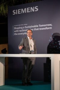 Η κεντρική εκδήλωση ξεκίνησε με την ομιλία του Δρ. Βασίλειου Χατζίκου, CEO Siemens A.E., και του Δήμου Σαπίδη, CEO Siemens Mobility A.E., με τίτλο «Ο Ψηφιακός Κόσμος του Αύριο: Επιταχύνοντας τη βιωσιμότητα στη βιομηχανία και τις υποδομές». Ο κεντρικός ομιλητής Dr. Mathias Oppelt, Head of Customer driven Innovation at Siemens AG Digital Industries, αφιέρωσε την ομιλία του στο μέλλον των βιομηχανικών δραστηριοτήτων, ενώ ακολούθησε ο Χάρης Τολούμης, Global Product Line Manager, Smart Infrastructure, Siemens AG, ο οποίος επικεντρώθηκε στα έξυπνα κτήρια και στις τεχνολογίες και στις λύσεις που μειώνουν το περιβαλλοντικό τους αποτύπωμα. Οι ομιλίες ολοκληρώθηκαν με την εταιρεία MAGOS, που αποτελεί λαμπρό παράδειγμα νεοφυούς επιχειρηματικότητας, η οποία παρουσίασε το εξωσκελετικό γάντι που έχει αναπτύξει με δυνατότητα αφής σε περιβάλλον VR και το εύρος των εφαρμογών του. Η κεντρική σκηνή έκλεισε με μια συζήτηση εφ’ όλης της ύλης σχετικά με τον ψηφιακό μετασχηματισμό και την έννοια της συν-δημιουργίας και των συνεργειών τεχνολογικών παρόχων και start-up στο νέο επιχειρηματικό οικοσύστημα.